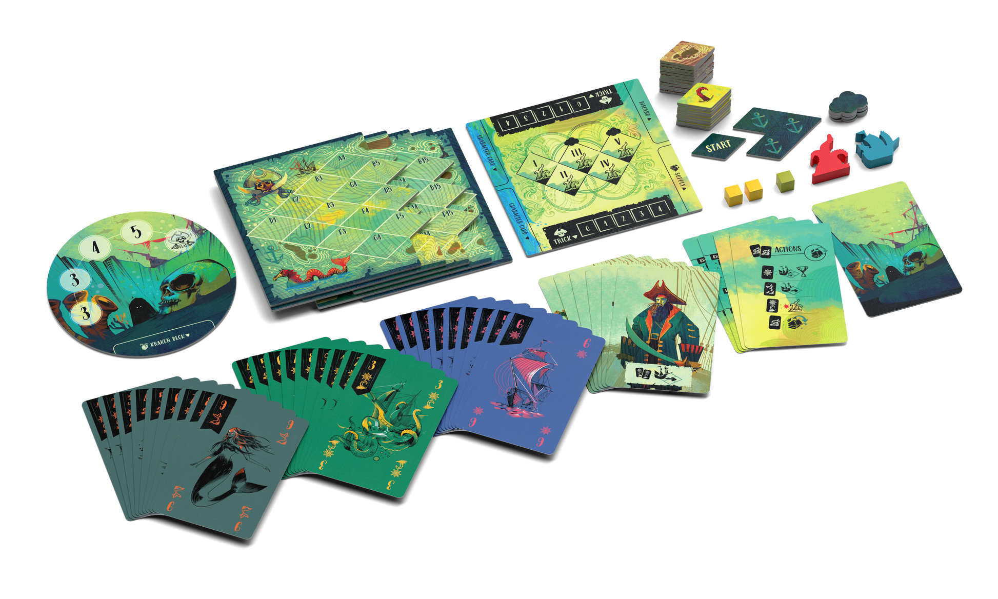 One player starts the round by playing a card, then their partner follows suit if they're able. Depending on the combinations of icons on the cards, your ship will either move forward, move towards the winner of the trick, or take other actions.