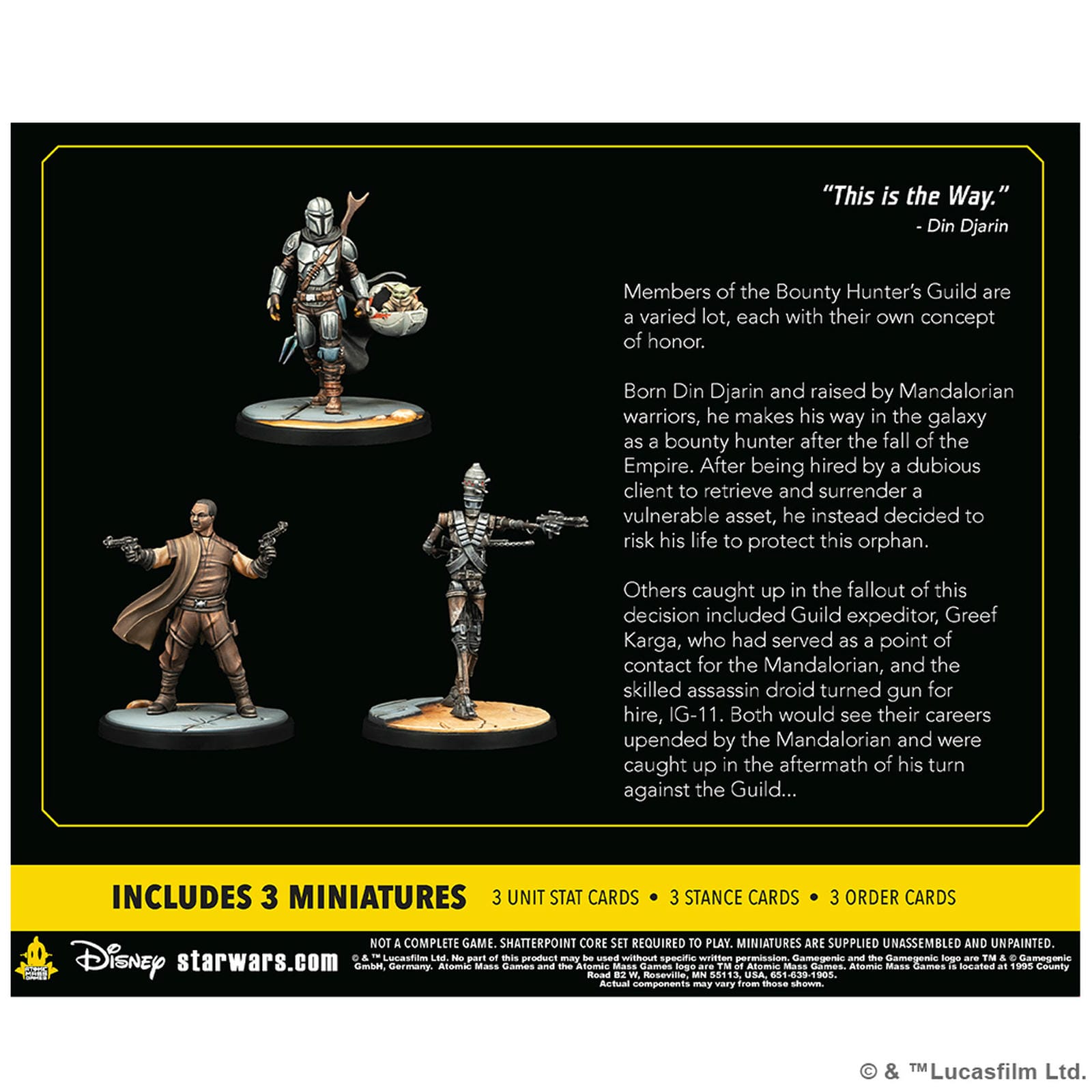 The infamous Bounty Hunters' Guild comes to Star Wars™: Shatterpoint in this new Squad Pack! The Certified Guild Squad Pack brings The Mandalorian to the game as a Primary Unit alongside Greef Karga as a Secondary Unit and the Assassin droid IG-11 as a Supporting Unit. These characters can either form a complete squad on their own, or can be mixed and matched with other characters in a completely custom squad. No matter who they're partnered with, this pack includes all the Stat, Stance, and Order cards players need to add them to their games of Shatterpoint.