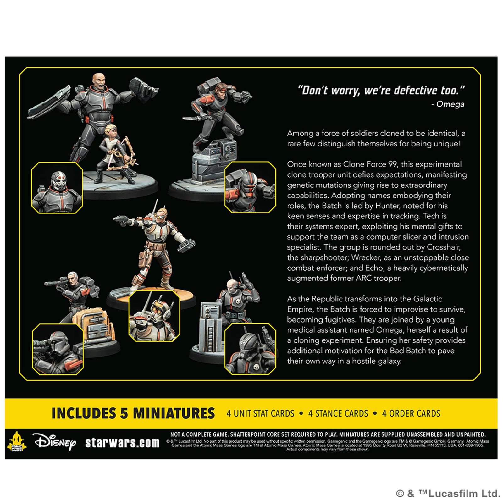 Clone Force 99 joins Star Wars™: Shatterpoint in this new Squad Pack! Commonly known as the Bad Batch, the characters in this pack give players a variety of new squad building options, beginning with Clone Sergeant Hunter as a Primary Unit in both the Clone Wars and Galactic Civil War eras. Joining him as dual era units are Wrecker and Omega as a new Secondary Unit option and Echo and Tech as a Supporting Unit. Rounding out the pack is the sniper Crosshair who enters the game as a Clone Wars-era Secondary Unit.
