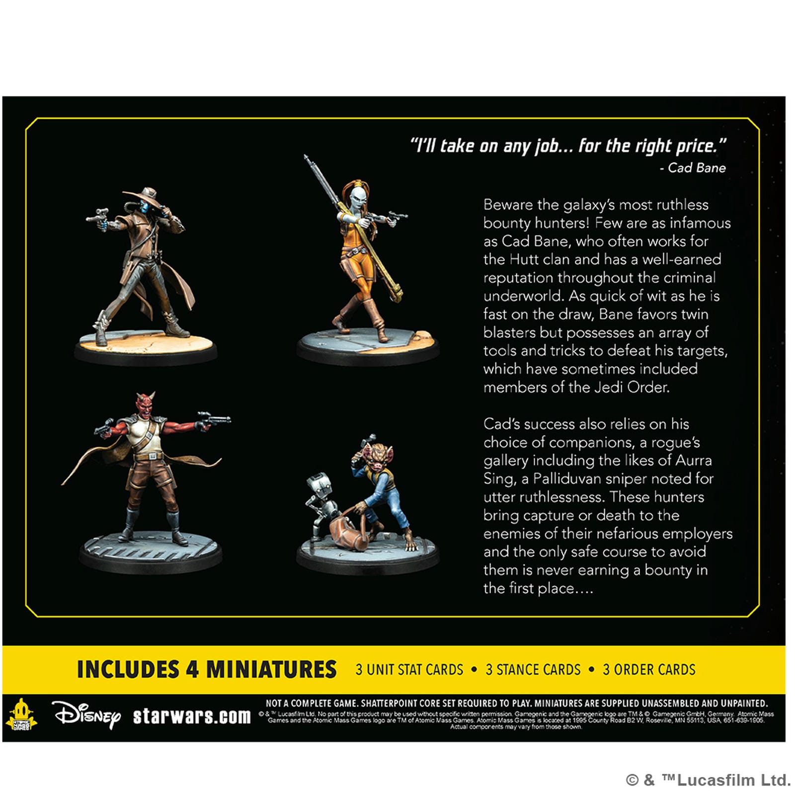 The galaxy's most ruthless bounty hunters enter Star Wars: Shatterpoint in this pack! The clever and fearsome Cad Bane has built his reputation working for the Hutts and even Darth Sidious himself and this pack adds him to the game as a Primary Unit. Joining him are the deadly Aurra Sing as a Secondary Unit and a Bounty Hunter unit consisting of a Chadran-Fan, Todo 360, and a Devaronian as new Supporting Unit. In addition to beautifully sculpted miniatures of these characters, this pack also includes all the Unit, Stance, and Order cards for players to make full use of them in Star Wars: Shatterpoint!