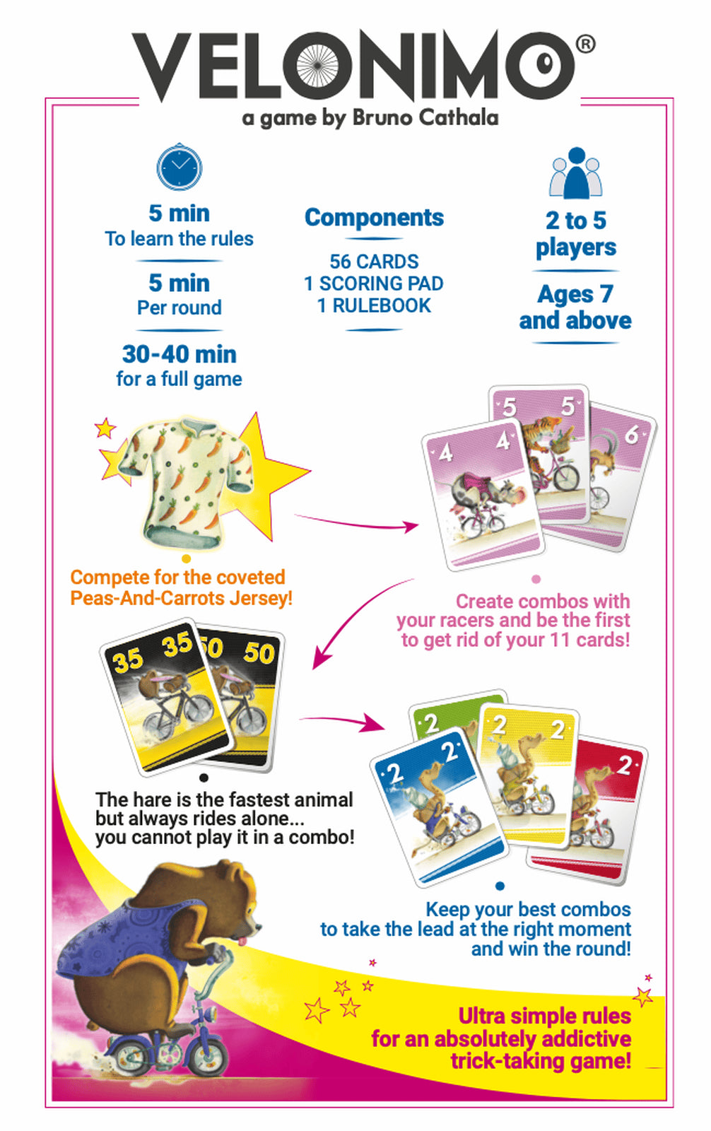 The card game Velonimo allows you to depict the merciless struggle in the animal world for the distinctive and highly prized "peas and carrots" jersey rewarded to the best climbing cyclist. This trick taking game features ultra simple rules for an absolutely addictive play experience.
